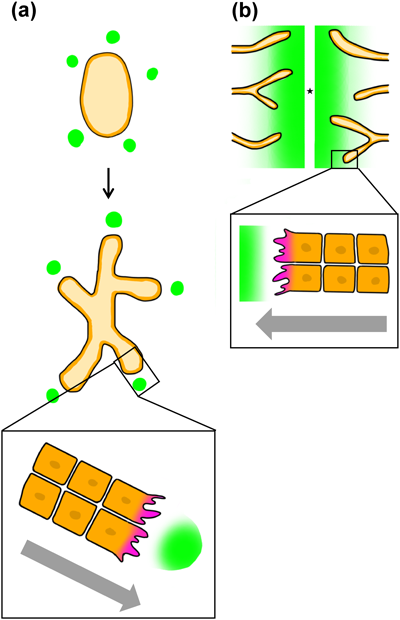 脊椎動物の血管新生においても,リーダー細胞依存型の集団細胞運動が観察される.血管新生は,既存の血管から新しい血管が伸びていく過程であり,この際に血管内皮成長因子(vascular endothelial growth factor:VEGF)の必要性が明らかになっている.VEGFは,血管周囲に局在して濃度勾配を形成し,リーダー細胞を誘導するシグナルを提供する.