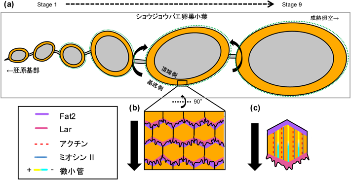 卵室の回転運動には,Fat2およびLarと呼ばれる非典型的なカドヘリンファミリーのタンパク質が関与している35, 36).Fat2は細胞の後端に局在し,Larは細胞の前端に局在する(図3b).この二つのタンパク質は,細胞がアクチンフィラメントを介して基底膜に沿って移動する際の力学的な協調を調整し,回転運動を円滑に進行させる役割を果たしている.特にFat2は,回転方向に対して後続する細胞が前端に突出を形成する際のシグナルとして機能し,後続の細胞に運動の方向性を伝える(図3b).また,Larは回転方向に対して前端で細胞の突出形成を促進し,基底膜に沿った滑らかな移動を推進する(図3b).このように,細胞間での非細胞自律的なシグナル伝達により,卵室全体が調和のとれた運動を実現している