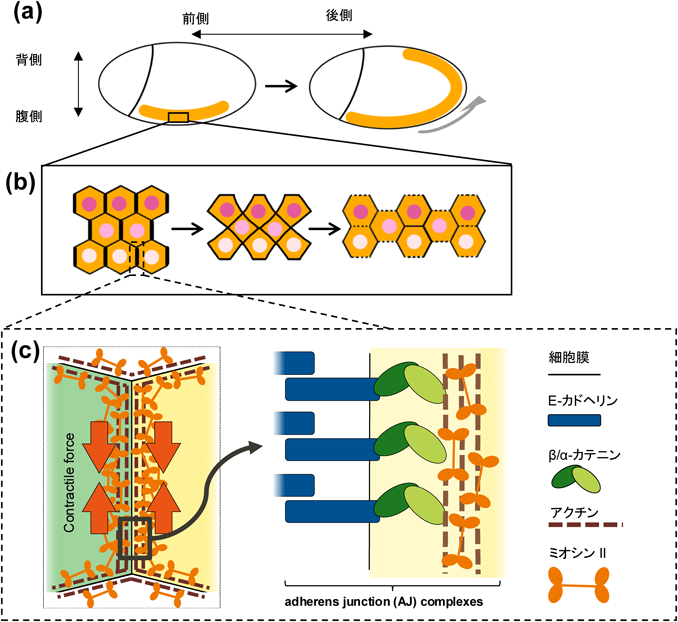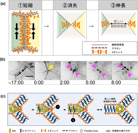生殖器回転における集団細胞移動では,細胞接着リモデリングが重要な役割を果たしていることは,これまでの説明でご理解いただけたのではないかと思う.しかしながら,バーテックスモデルによる数理シミュレーションから,細胞接着リモデリングだけではなく,そのプロセスがスムーズに進行し,連続的でなければ移動は停止してしまうことが予想された.細胞接着リモデリングの仕組みとしてわかっていたことは,①隣り合う細胞の細胞接着面にミオシンIIが集積すると,その細胞接着面は短縮し,②やがて消失して四つの細胞が1点で接する点を形成し,③さらに,この接合点から新たな細胞接着面が,元の接着面とは垂直方向に伸張する,と三段階に大別される(図6a).この③の,新規細胞接着を伸長させる過程がリモデリングの完遂と継続に必要であるが,そのメカニズムが十分に解明されていなかった.