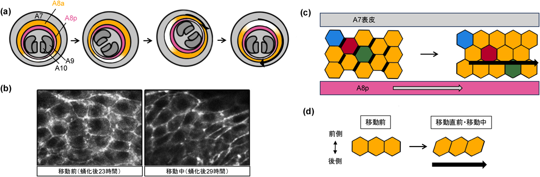 これらの結果に基づき,細胞接着リモデリングによる新たな集団細胞移動モデルを提唱した(図5c).通常の収斂伸長では,前後軸に垂直な細胞接着面が収縮し,組織が前後軸に沿って伸長する41).しかし,A8aではミオシンIIの作用により,前後軸に対して右斜め方向の接着面が収縮するため,組織は左上から右下にかけて伸展しようとする.ただし,A8aは腹部第7体節(A7)とA8pに挟まれており,前後軸方向の伸展は物理的に制限されている.さらに,A8aの前部に接触しているA7は移動しないため,結果的にA8aの細胞群は右方向へと押し出されるようにして移動する.これは,左右非対称な細胞接着リモデリングが,一方向への上皮細胞の移動を促進するという新たな発見である.