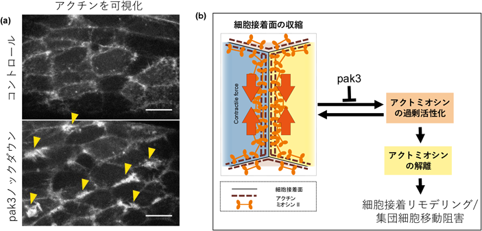 Pak3ノックダウンやPak3変異体の解析結果は,細胞間接着面のダイナミクス調節機構に,ネガティブフィードバック経路が存在することを示している(図7b).アクトミオシンによる収縮力が細胞接着面の短縮を駆動する際,この収縮力の上流にある活性化メカニズムが,WAVE調節複合体による枝状アクチンネットワークの形成とも部分的に関連している場合がある.このような場合,枝状アクチンネットワークの形成が分子分布を変化させ,結果として短縮動態が逆に妨げられることがある.これは,収縮力の誘導単独では目的とする収縮を達成できない可能性があり,収縮力と連携して,その収縮を妨害しないメカニズムが必要であることを示唆している.アクチンを介した収縮力を誘導する上流のシグナル経路と,力の生成中にアクチン動態を調整する下流メカニズムの両方が,細胞の適切な運動を厳密に制御している可能性がある.このようなネガティブ・フィードバックの微調整はアクチンによる収縮と拡張のような相反する動態が混在する上皮組織の形態形成にとって有益であると考える.