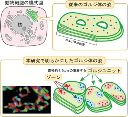 これまで,ゴルジ体は,「槽(cisternae)」と呼ばれる膜で包まれた扁平な袋が複数積み重なった層板構造をしていると考えられていた(図1上段右).我々はゴルジ槽が単なる大きな膜からできた構造ではなく,長径1~3 µmのゴルジユニットが集合してできていることを示した(図1下段).ゴルジ体がこのような構造を持つことは糖鎖合成のために大きなメリットがあると思われる.たとえば,一つのタンパク質上に複数の糖鎖修飾が起こることがよくあるが,本研究で明らかにしたゴルジ体の形態はこのような糖鎖修飾を行う上で有利に働くと考えられる.つまり,3種類の糖鎖修飾に関わる酵素が小さなゴルジユニットにすべて含まれ,それらがユニットの辺縁部を動き回ることで,短時間の間に酵素と基質タンパク質が高い確率で出会うことができるため,一つのタンパク質上に効率よく多くの種類の糖鎖修飾を行えるようにしていると考えられる.