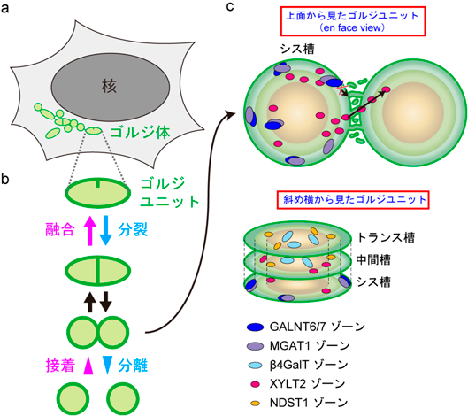 またFRAPの結果から,サイズの小さなXYLT2ゾーンはサイズの大きなGALNT6ゾーンに比べてゴルジユニット間に存在する何らかのバリアを超えて動き回りやすい性質を持つと考えられるが,それはゾーンの大きさだけで説明可能かという点についても検証の必要がある.