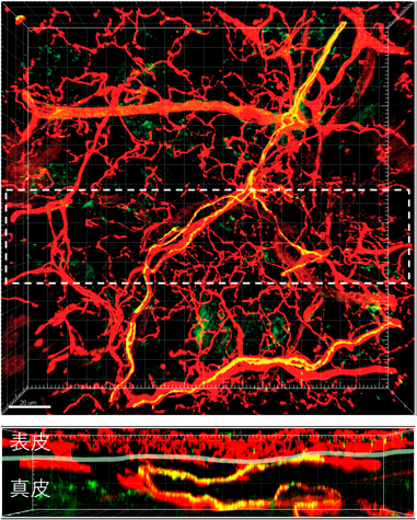上:皮膚を垂直方向から見た像.下:上の像の点線四角部分を水平方向から見た像.赤:すべての無髄神経と一部の有髄神経.緑:IL-31受容体サブユニットIL-31RA.スケールバー:20マイクロメートル.