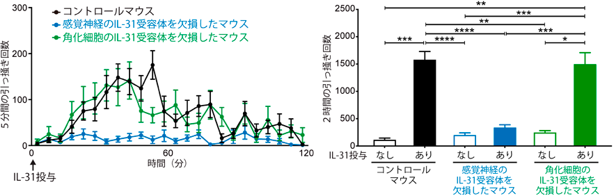 IL-31受容体を欠損していないマウス(コントロールマウス),感覚神経においてのみIL-31受容体を欠損したマウス,角化細胞においてのみIL-31受容体を欠損したマウスに,IL-31を皮下投与し,その直後から5分ごとの引っ掻き回数(左グラフ)と2時間の引っ掻き回数(右グラフ)を示す.*p<0.05, **p<0.01, ***p<0.001, ****p<0.0001 (one-way ANOVA with Bonferroni’s post-test).