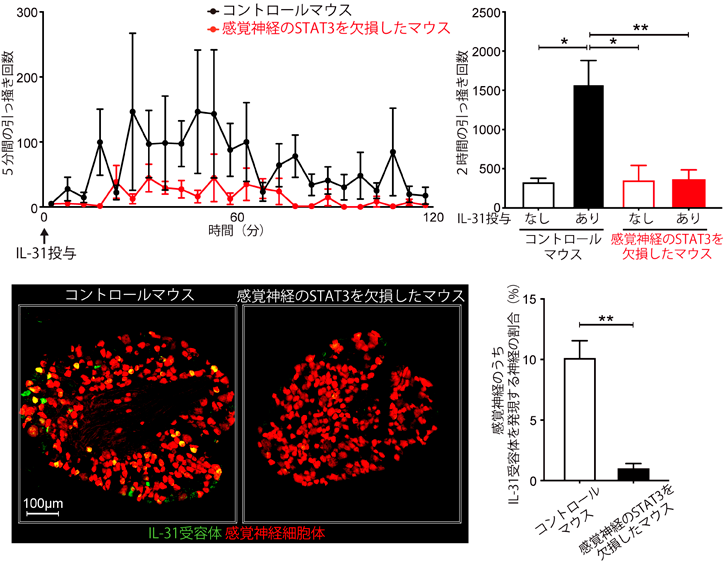 上段には,STAT3を欠損していないマウス(コントロールマウス)と,感覚神経においてのみSTAT3を欠損させたマウスに,IL-31を皮下投与し,その直後から5分ごとの引っ掻き回数(左グラフ)と2時間の引っ掻き回数(右グラフ)を示す.下段画像は,コントロールマウスと,感覚神経においてのみSTAT3を欠損したマウスから,後根神経節の切片を作製し,IL-31受容体(緑)および感覚神経(赤)をそれぞれに対し特異的な抗体を用いて染色したもの.下段グラフは,後根神経節切片染色像の解析をもとに,IL-31受容体を発現する感覚神経細胞の割合を定量した.