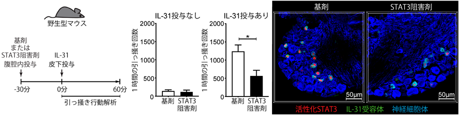 左側の模式図のように,野生型マウスに,基剤のみ,またはSTAT3阻害剤を含んだ基剤を腹腔内投与し,その30分後にIL-31を皮下投与して,その後60分間の引っ掻き回数を中央のグラフに示す.右側の画像は,IL-31を皮下投与してから15分後の後根神経節の切片の染色画像で,IL-31受容体(緑)を発現した感覚神経(青)の細胞核における活性化STAT3(赤)の蓄積が,STAT3阻害剤投与により減弱している様子が示されている.*p<0.05 (two-tailed Student’s t test).