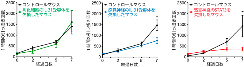 IL-4, IL-13, IL-31といったサイトカインシグナルが,どのように感覚神経を活性化するのかについては,まだまだ謎が多い.これらの受容体直下ではヤヌスキナーゼ(JAK)が活性化され,これらのサイトカインによる痒みにおいても,感覚神経のJAKが重要であることは報告されていた10).JAKの下流ではSTATファミリーの活性化が起こり,細胞核の中へと移行して転写因子として働く.免疫細胞をはじめ多くの細胞のサイトカイン応答において,STATファミリーによる遺伝子発現誘導が,重要な役割を果たすことが知られている.しかしながら,痒み誘導における感覚神経のSTATファミリーの役割は,限定的なのではないかと考えられていた.後根神経節から単離した感覚神経を,上記のサイトカインで刺激すると,活性化のイベントの一つである細胞内カルシウム上昇が起こるが,これはサイトカイン刺激後の数分以内に起こりうることが報告され,これにSTATファミリーによる遺伝子発現誘導が関与するのは,時間的に考えにくいと思われた10).しかしながら,図3にも示すように,IL-31投与後,マウスの引っ掻き行動は15分以上経過してから起こるため,筆者らは,痒み誘導にSTATファミリーによる遺伝子発現誘導が関与しうるかもしれないと考えた.
