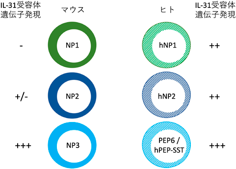 マウスの後根神経節では,11~12種類の感覚神経細胞サブセットのうち,3種類のサブセットに,痒みを惹起する物質の受容体の遺伝子が発現していることが示された2–4).異なる呼称を使っている報告もあるが,非ペプチド作動性(non-peptidergic:NP)のNP1, NP2, NP3という呼称が,この3種類のサブセットに対して現時点では最もよく使われている.ただ,この呼称には問題もある.侵害受容器のうち,カルシトニン遺伝子関連ペプチド(calcitonin gene related peptide:CGRP)やサブスタンスPといった神経ペプチドを放出する神経をペプチド作動性(peptidergic:PEP),それ以外の侵害受容器を非ペプチド作動性としているが,実際にはNP2もCGRPを発現しており,またその他にもNP1, NP2, NP3に発現する神経ペプチドやペプチドホルモンが存在する.そしてこの問題は,後に述べるとおり,ヒトの感覚神経サブセットの解析結果でも顕著となっている.そのため,いずれは別の呼称に改められる可能性もあるが,ここではこの呼称を使うこととする.NP1, NP2, NP3神経の特徴については,筆者が以前,別の稿でまとめているので,それを引用し,その後のアップデートを加えて述べる2, 5).