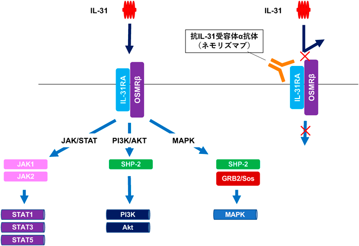 IL-31はIL-6ファミリーに属するサイトカインで,活性化T細胞由来のcDNAからクローニングされた.IL-31を高発現させたマウスは重度の痒み,皮膚炎,脱毛を示し,AD様の症状を呈する.AD患者の皮膚組織内ではIL-31 mRNAの発現が上昇し,特に痒みの強い皮疹部での上昇がみられる.IL-31受容体はIL-31 receptor α(IL-31RA)とoncostatin M receptor β(OSMRβ)のヘテロ二量体で構成され,IL-31の結合により細胞内でのシグナル伝達が行われる(図2).一次感覚神経に発現するIL-31受容体からのシグナルは,強い痒みとして認識される.このため,IL-31受容体の阻害は痒みの抑制に有効であり,抗IL-31受容体抗体であるネモリズマブの開発が進められ,今日,臨床の現場で用いられるに至った.