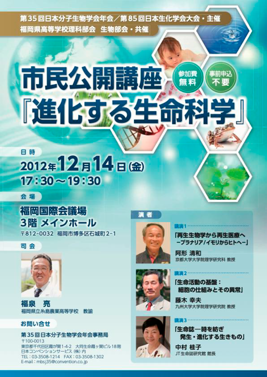 第35回日本分子生物学会/第85回日本生化学会・主催,福岡県高等学校理科部会生物部会・共催市民公開講座「進化する生命科学」を中日12月14日に開催しました(福岡国際会議場3階メインホール).司会は福泉亮(福岡県立糸島農業高校教諭),講演者は阿形清和「再生生物学から再生医療へ—プラナリア/イモリからヒトへ—」,藤木幸夫「生命活動の基盤:細胞の仕組みとその異常」,中村桂子(JT生命誌研究館)「生命誌—時を紡ぎ発生・進化する生きもの」(写真1).視聴者はホールを満たし盛会でした.