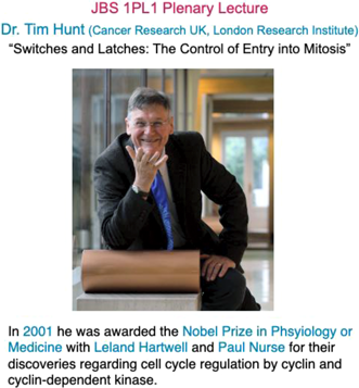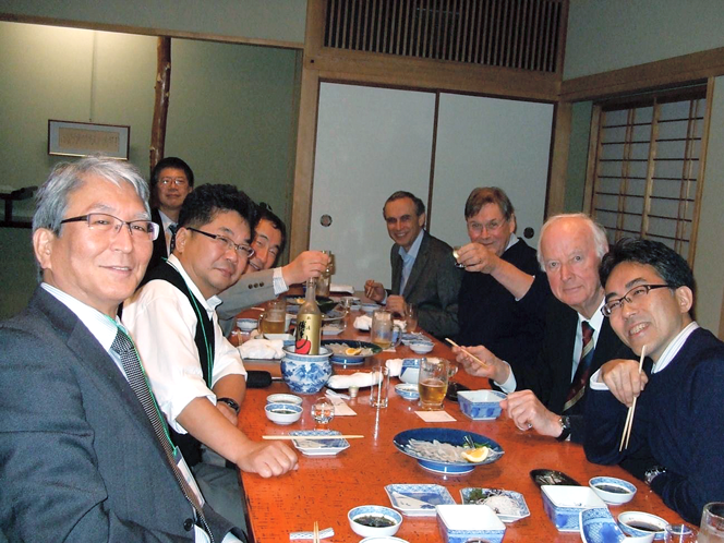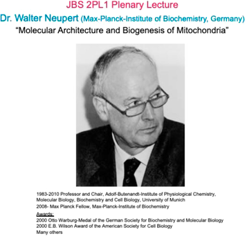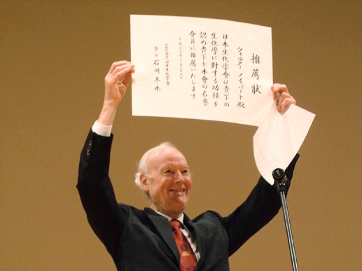 R. Tim Hunt博士(London Research Institute, Cancer Research UK,九州大学高等研究院栄誉教授,写真2),Walter Neupert博士(Max Planck Institute of Biochemistry, Germany,九州大学名誉博士,写真3)に,それぞれ「Switches and Latches:The Control of Entry into Mitosis」,「Molecular Architecture and Biogenesis of Mitochondria」の演題で両博士のライフワークを分かり易く講演いただき,真の研究をご教授いただきました.Neupert博士は,講演後壇上で生化学会海外名誉会員証を授与されました(写真4).Hunt博士はすでに名誉会員です.会期中には両博士を囲む懇親会が催されました(写真5~7).