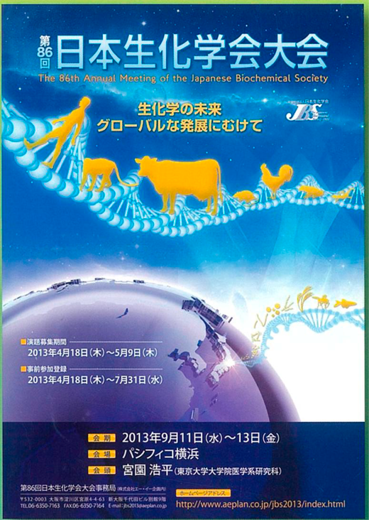 私は2013年9月11日~13日に第86回日本生化学会大会(於:パシフィコ横浜)の会頭を務めさせていただいた.会頭が決まったのがちょうど医学系研究科長を拝命したころで,全く気持ちに余裕がなかったが,個人的には学生時代から生化学が大好きだったので,会頭を務めさせていただくことは大変名誉なことと考え,お引き受けすることとした.当時は分子生物学会との合同開催となる場合と,生化学会単独開催の場合があったが,2012年の生化学会大会が分子生物学会と連続開催するという形を取られたこともあり,私は生化学会単独で開催してみようと考え準備を開始した.