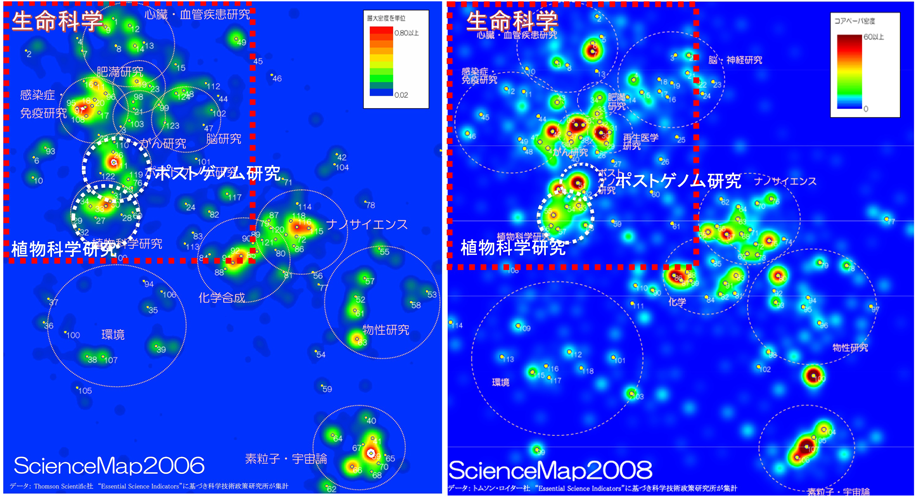生化学会は,微生物から高等生物に至る多様な生物を対象とするが,原点が医学系分野だったことから,植物科学への関心はそれほど高くなかったように思う.この流れを変えたのが,2000年のモデル植物シロイヌナズナの全ゲノム解読完了である.ヒトゲノム概要解読の3年前である.図2のサイエンスマップ2006と2008[文部科学省科学技術・学術政策研究所(NISTEP)]をみると,当時,植物科学といわゆるライフサイエンスの研究領域が「ポストゲノム研究」を介して近づいていることがわかる.