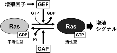 他の稿においても記述されていることと思うが,Rasファミリーを代表とする低分子量Gタンパク質(small GTPases)の多くは,GTP(グアノシン三リン酸)結合状態で活性化し,GDP(グアノシン二リン酸)結合状態で不活性化する1).これらは細胞内シグナル伝達における分子スイッチとして機能し,細胞増殖,分化,細胞運動,膜輸送などの多様な生理機能を制御する2).Rasファミリーは,GTP/GDPの交換およびGTPの加水分解を介して活性が制御されるが,これらの過程は,GEF(guanine nucleotide exchange factor)やGAP(GTP-hydrolysis activating protein)による厳密な調節を受ける(図1).たとえばRasの場合,Sos(Son of Sevenless)やRasGRFがGEFとしてRasのGDP-GTP交換反応を促進する3).GTP結合型のRasは下流のシグナル分子(エフェクター)を活性化し,細胞増殖シグナルを刺激するが,過剰な活性化を防ぐためにGTPを加水分解して元の不活性型であるGDP結合型に戻る.この際,p120GAPやNF1(neurofibromin 1)などのGAPがGTP加水分解を促進する3).また,Rho, Rab, Arfファミリーなどは,細胞骨格制御や膜輸送などのRasとは異なる細胞機能を担い,それぞれ特異的な制御機構を持つ.
