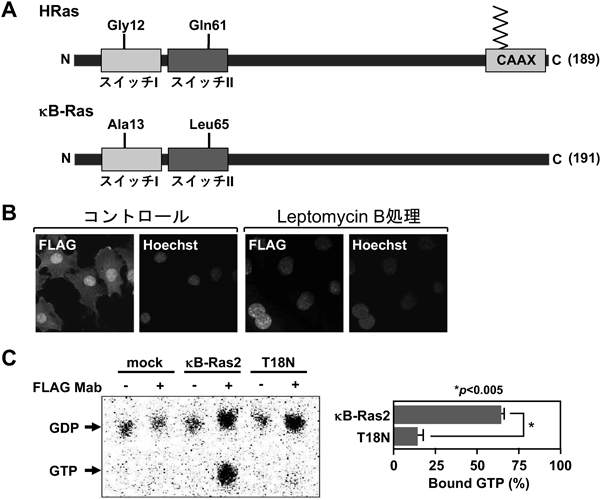 (A)κB-Rasの一次構造をHRasと比較した.(B)NIH-3T3細胞にFLAG-κB-Ras2を発現させた後,FLAG抗体を用いて免疫染色を行った.κB-Ras2は,NIH-3T3細胞の核と細胞質に局在したが,leptomycin Bで処理した結果,核内のみに局在した.(C)細胞内のGTPを[γ-32P]でラベルしたHEK293細胞において,発現させたκB-Ras2またはT18N変異体を免疫沈降し,結合するGDP/GTPを薄層クロマトグラフィーにより分離・検出した.野生型κB-Ras2はGTP結合型とGDP結合型の両方が存在したが,T18N変異体はGDPのみと結合した.(B)と(C)のデータは文献9より引用した.