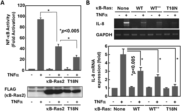 (A)HEK293細胞を用いてNF-κBのリポーター遺伝子アッセイを行った.野生型κB-Rasは,TNFα刺激によるNF-κBの活性化を顕著に抑制したが,その効果はT18N変異体の方が高かった.(B)IL-8 mRNAの発現誘導をRT-PCRで検討した.野生型κB-Ras(WTまたは三倍のDNA量のWT++)およびT17N変異体は,TNFα刺激によるIL-8 mRNAの発現誘導を抑制したが,その効果はT18N変異体の方が高かった.データは文献9より引用した.