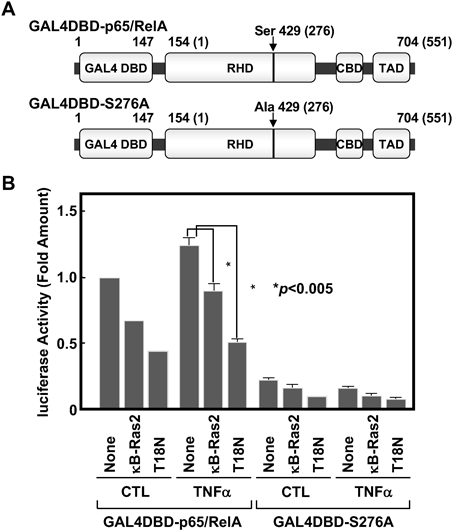 (A)NF-κBの転写活性化能を評価するため,酵母の転写因子GAL4のDNA結合ドメインにp65/RelAまたはp65/RelA(S276A)変異体を融合したタンパク質の発現系を構築した.(B)構築したGAL4DBD-p65/RelAまたはp65/RelA(S276A)変異体の発現系を用いてリポーター遺伝子アッセイを行った.野生型κB-RasおよびT18N変異体はNF-κBの転写活性化能を抑制したが,その抑制効果はT18N変異体の方が高かった.データは文献9より引用した.