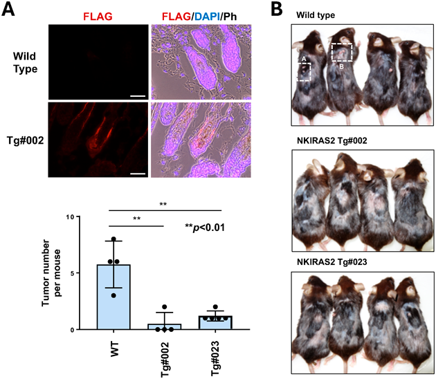 我々の研究グループも,マウスモデルを用いてκB-Rasの生理機能を解析するため,κB-Ras2を強制発現するトランスジェニックマウス(Tgマウス)の作製を試みた.はじめに,κB-Ras2を全身で発現するTgマウスの作製を試みたが,目的のマウスは得られなかった.この原因は不明であるが,細胞種によっては,κB-Rasが細胞増殖を抑制することが原因である可能性がある.そこで,κB-Ras2が皮膚の発達や腫瘍形成に与える影響を調べるため,K15(keratin 15)遺伝子プロモーターを用いてκB-Ras2を強制発現させるTgマウス(K15-NKIRas2-Tg)を作製した19).K15は,皮膚毛包中のfollicle bulgeと呼ばれる膨らんだ構造体に存在する皮膚幹細胞のマーカーとして知られている.FLAGタグを付加したκB-Ras2のcDNAをK15プロモーターの下流に挿入したプラスミドを作製し,そのDNA断片を受精マウス卵母細胞に注入した.その結果,二系列のTgマウス(K15-NKIRas2-Tg#002およびK15-NKIRas2-Tg#023)が得られた.これらのマウス新生仔から皮膚切片を調製し,Tgマウスおよび野生型マウスの皮膚におけるκB-Ras2の発現を調べた.マウスの内在性κB-Ras2(Nkiras2)は,ユビキタスに発現しているが,Tgマウス#002と#023では,毛包におけるκB-Ras2の発現強度が高いことが観察された.また,遺伝子導入したκB-Ras2のアミノ末端にはFLAGタグが付加されているため,抗FLAG抗体を用いてκB-Ras2の外因性発現を検出した.その結果,図5Aに示すように,Tgマウスのfollicle bulgeでFLAG-κB-Ras2の発現が特異的に検出された.