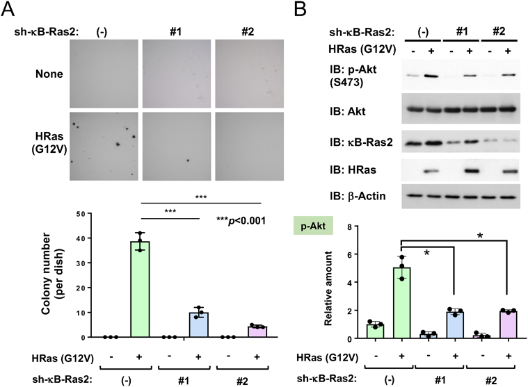 (A)sh-RNAによりκB-Ras2をノックダウンしたNIH-3T3細胞を用いてHRas(G12V)変異体による形質転換を行った.形質転換した細胞を用いて軟寒天コロニー形成実験を行った結果,κB-Ras2のノックダウンは,がん細胞のコロニー形成を抑制した.(B)細胞内のシグナル伝達系を調べた結果,κB-Ras2のノックダウンは,Aktの活性化を阻害することが明らかになった.データは文献19から引用した.
