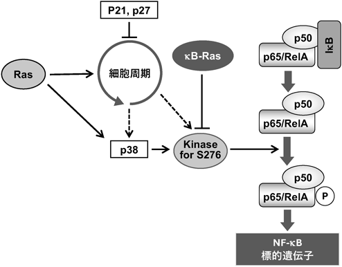 p65/RelAのSer-276のリン酸化は,転写活性化因子p300/CBPとNF-κBの相互作用を引き起こす重要な要因であることが知られている15).これまでの実験結果を踏まえ,我々は研究をさらに進めた結果,κB-Rasがp65/RelAのリン酸化を抑制し,その結果としてNF-κBとp300/CBPの相互作用を阻害することによりNF-κBの活性化を抑制するという新しい分子機構のモデルを提唱した.
