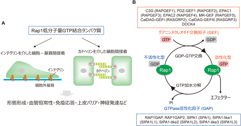 他のGタンパク質と同様に,Rap1はGDP結合不活性型からGTP結合活性型へと変換されることでエフェクター分子に結合し,下流へシグナルを伝達する2).Gタンパク質の活性は,GDPからGTPへの変換を促進するグアニンヌクレオチド交換因子(guanine nucleotide exchange factor:GEF)と,Gタンパク質のGTP加水分解活性を促進するGTPase活性化因子(GTPase activating protein:GAP)によって制御される(図1B).Rap1 GEFとして,触媒領域であるCdc25ホモロジードメインを有するC3G(RAPGEF1), PDZ-GEF1(RAPGEF2), EPAC1(RAPGEF3), EPAC2(RAPGEF4), MR-GEF(RAPGEF5), CalDAG-GEFI(RASGRP2), CalDAG-GEFIII(RASGRP3)が同定されている4, 10, 11).また,Cdc25ホモロジードメインを持たず異なる様式でRap1を活性化するDOCK4も存在する12).これらのRap1 GEFは,さまざまな上流シグナルによって活性化される.たとえば,C3Gはインテグリン接着によりCrkアダプタータンパク質を介して活性化され,EPAC1やEPAC2はサイクリックAMP(cAMP),CalDAG-GEF1やCalDAG-GEFIIIはカルシウムやジアシルグリセロールといったセカンドメッセンジャーによって活性化される10, 13, 14).これらの知見は,Rap1の活性が多様な上流シグナルによって厳密に制御されており,Rap1が細胞機能の制御において重要な分子であることを示唆している.一方,Rap1 GAPとしては,RAP1GAP, RAP1GAP2, SIPA1(SPA1), SIPA1-like1(SIPA1L1), SIPA1-like2(SIPA1L2), SIPA1-like3(SIPA1L3)が報告されており,それらの活性は転写調節,リン酸化などの翻訳後修飾,タンパク質間相互作用などによって制御されている4).