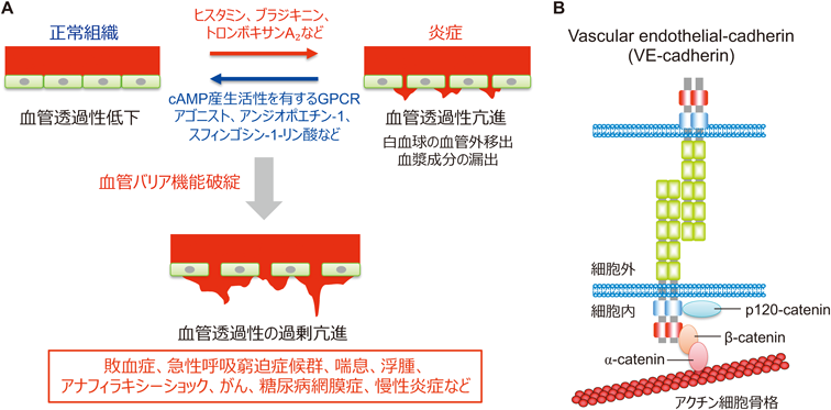 血管の内腔面では,血管内皮細胞が互いに接着することでバリア機能を有するシートを形成し,血管透過性を低い状態に維持している.末梢組織の血管では,内皮特異的な接着分子vascular endothelial(VE)-cadherin(別名Cadherin-5,CD144)が,細胞間接着を形成し,血液と血管外との物質移動を制限することで,生体恒常性を維持している15).正常組織では,VE-cadherinが強固な細胞間接着を形成し,血管透過性を低い状態に保っているが,炎症が誘導されるとVE-cadherin接着の減弱により血管透過性が亢進し,免疫細胞の血管外移出や血漿成分の漏出が誘導される(図2A)16).そのため血管内皮細胞には,血管透過性をダイナミックかつ厳密に制御するための仕組みが備わっており,その制御機構の破綻は,敗血症,急性呼吸窮迫症候群,喘息,浮腫,アナフィラキシーショック,がん,糖尿病網膜症,慢性炎症などさまざまな疾患の発症や進展と密接に関連している(図2A)17).
