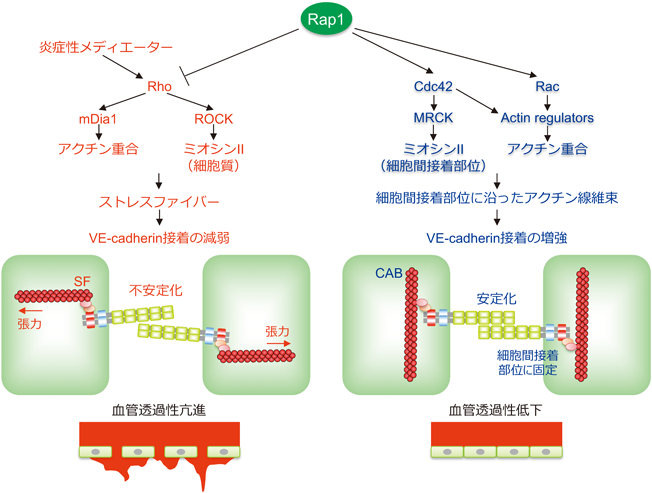 さらに,Rap1がVE-cadherin接着を増強する機構を解析した結果,Rap1はアクチン細胞骨格を劇的に再編することでVE-cadherin接着を制御することが明らかとなった(図3)5, 19, 25).ヒスタミン,ブラジキニン,トロンボキサンA2などの炎症性メディエーターは,Rho低分子量Gタンパク質を介して収縮性アクチン線維であるストレスファイバー(stress fiber:SF)の形成を促し,血管透過性を亢進させる26, 27).Rho依存的に形成されたSFは,細胞間接着部位と直交するようにVE-cadherinに結合し,張力を生じることでVE-cadherin接着を不安定化させ,血管透過性を亢進させる.一方,Rap1はRhoの活性を抑制することで,炎症性メディエーターによるSFの形成を阻害し,VE-cadherin接着の安定性を維持する25).Rap1によるRho抑制に関わるエフェクター分子として,Ras-interacting protein 1(Rasip-1)やRas-association and dilute domain-containing protein(Radil)が同定されている5, 28).Rasip-1やRadilは,Rap1依存性にRho GAPの一つArhGAP29を活性化し,Rhoを不活性化する28, 29).さらに,Rap1は,Rhoファミリーの別の低分子量Gタンパク質であるCdc42を活性化し,細胞間接着部位に沿ったアクチン線維束(circumferential actin bundle:CAB)を形成する25).このとき,Rap1はCdc42 GEFの一つFYVE, RhoGEF and PH domain containing 5(FGD5)を介して,細胞間接着部位におけるCdc42を活性化し,CAB形成を促進する.CABは,α-/β-cateninを介してVE-cadherinを細胞間接着部位に固定し,バリア機能の高い細胞間接着装置を構築することで,血管透過性を低い状態に維持する.すなわち,Rap1はRhoを抑制することでSFの形成を抑え,その一方で,Cdc42依存性にCABを形成することでVE-cadherin接着を増強し,血管バリア機能を強めている(図3).