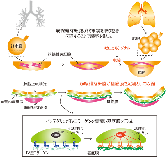 本研究により,血管内皮細胞においてRap1は,インテグリンの接着活性を亢進し,IV型コラーゲンを細胞膜近傍にリクルートすることで基底膜の形成を促進することが明らかとなった(図4).さらに,筋線維芽細胞は,内皮細胞が形成した基底膜を足場としてメカニカルシグナルを活性化し,収縮することで肺胞を形成することが示された(図4).これまで,血管内皮細胞はアンジオクラインファクターと呼ばれるシグナル伝達分子を産生し,臓器や組織の形成や再生を制御することが知られていた.本研究により,血管内皮細胞はアンジオクラインファクターの産生に加えて,自身の細胞機能を駆使することで,臓器や組織の形態形成を制御していることが明らかとなった.