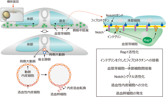 以上の結果から,Rap1bはインテグリン接着活性を促進することで,血管芽細胞を体節境界部のフィブロネクチンに効率的に接着させ,血管芽細胞とNotchリガンドを発現する体節細胞との接着を亢進すること,さらにこの細胞間接着の亢進が血管芽細胞におけるNotchシグナルの活性化を促し,それにより血管芽細胞が造血性内皮細胞の運命を獲得することが示された(図5)52).
