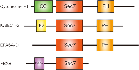 | EPI64 (TBC1D10A) | Rab27不活性化因子 | Arf6の活性化とEPI64によるRab27aの不活性化によるエンドサイトーシスの制御 | cytohesin-2 | PH | 71 |