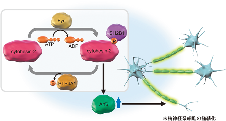 発生が進行するとともに,Arf6の活性を維持するcytohesin-1がcytohesin-2に変わり,髄鞘化過程をさらに促進する.cytohesin-2もcytohesin-1の活性化メカニズムと類似しており,FynがそのC末端をリン酸化することで活性化されるが,その詳細なメカニズムは非常にユニークである(図5).坐骨神経においてcytohesin-2の発現誘導に伴って脱リン酸化酵素であるprotein tyrosine phosphatase 4A1(PTP4A1)とSrc homology 2 family member B1(SH2B1)の発現上昇がみられる.シュワン細胞にはリン酸化チロシンに特異的に働くPTP4A1, protein tyrosine phosphatase non-receptor type 1(PTPN1),PTPN13, PTPN2の4種類の脱リン酵素の転写産物が存在するが,これらのなかでPTP4A1のみがリン酸化され活性化されたcytohesin-2を脱リン酸化できる99).一方,リン酸化されたcytohesin-2と特異的に結合する分子をゲノムワイドに調べたところ,SH2B1が同定された.興味深いことに,SH2B1はリン酸化されたcytohesin-2に特異的に結合し,PTP4A1による脱リン酸化と拮抗することでcytohesin-2の活性を維持することが判明した(図6)99).PTP4A1とSH2B1の発現は生後初期にはほとんど確認されないため,このメカニズムはcytohesin-2に特異的なものであると考えられた.また,オリゴデンドロサイトと同様に,Arf6の負の制御因子としてACAP2が関与する可能性が考えられる.