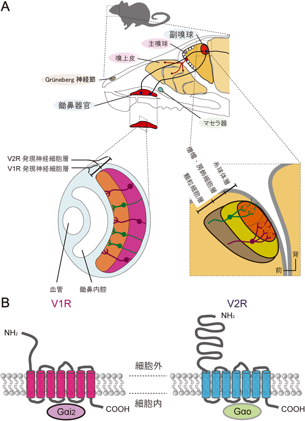 一方,マウスなどのげっ歯類を筆頭とした陸生の脊椎動物の多くは嗅上皮だけでなく,鼻腔下部に位置する鋤鼻器官(vomeronasal organ:VNO),Grüneberg神経節,マセラ器と嗅覚に関連した複数の受容器官を有している(図1A).これらのうち鋤鼻器官はフェロモン等のリガンドを介したコミュニケーションにおいて重要な役割を担っている.フェロモンは「生物が体外に分泌し,同種の他個体において作用する化学物質」と定義され,同種間のコミュニケーションに重要な役割を担っている.1959年にButenandtによって発見されたメスのカイコガが放出するボンビコールは化学的に機能が同定された初めてのフェロモンとして知られている4).