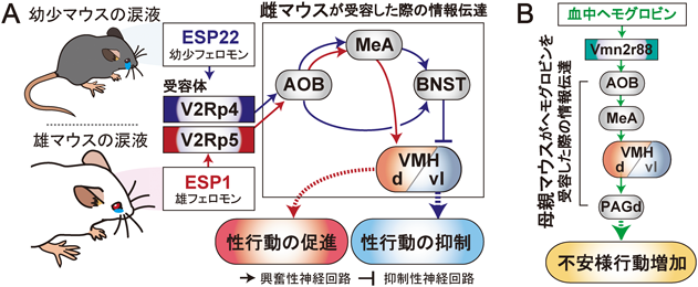 神経回路基盤の解析が進んでいる雄フェロモンESP1を例にとると,受容体V2Rp5からAOBへとリガンド情報が伝達されたのちに,雄マウスにおいては扁桃体内側核の後腹部(posteroventral MeA:MeApv)からMPOAへの伝達が行われる.一方で,雌マウスではMeApvからVMHd,そして,背側の中脳灰白質(dorsal part of periaqueductal gray:PAGd)へと情報が伝達され,性的二型の性質を持った情報伝達機構が明らかにされている(図3A)31).この特徴はESP1が雄マウスでは攻撃行動を促進し,雌マウスでは性行動を促進するという異なる行動出力を導くこととも矛盾しない.幼少期マウスの涙液中に含まれるESP22が雌マウスの性行動を抑制する際には,BNSTからVMHvlへと投射される抑制性の経路が重要な役割を担っていることが示されている(図3A)20).VMHvlが雌の性行動を促進させる機能を有することを鑑みると,BNSTからの抑制性入力がVMHvlの神経活動を抑えているがゆえに生じる性行動抑制であると推測することができる.ESP1とESP22は相同性の高い受容体で受容されるものの,それぞれが特異的な情報伝達経路を介して性行動を逆方向に制御するという興味深い特徴を有している.