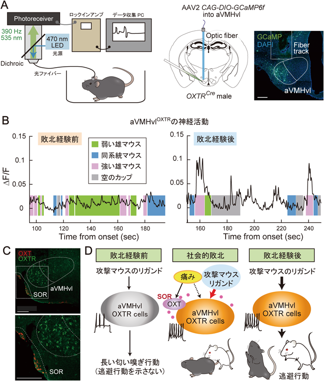 社会的ヒエラルキーの中に存在するコミュニティにおいて,攻撃行動(aggression)が相手個体の社会的敗北(social defeat)と対をなして存在することは自明である.社会的順位の高い個体(aggressor)に遭遇し敗北を経験したマウスは,再度aggressorに遭遇した際に強い逃避行動を示す64).すなわち,敗北経験前の頻繫なアプローチや匂い嗅ぎ行動と比較するとまったく異なる行動パターンを見せるようになる.このような可塑的な行動変容の背後には行動を制御する神経回路基盤における可塑性が存在していると予想された.社会的敗北時に重要であることが示されていたaVMHvlであるが,同領域にはEsr1陽性細胞だけでなくオキシトシン受容体(oxytocin receptor:OXTR)発現細胞も豊富に分布する65, 66).筆者がLin研究室における研究を開始した2018年当時,VMHvlに分布するOXTRの機能には未解明な点が多く存在した.そこで筆者らは,ファイバーフォトメトリー法(図5A)を用いてaVMHvlOXTRの神経活動の記録を行った67).すると,aggressorに遭遇した際のaVMHvlOXTRの活動を敗北経験前後で比較すると敗北経験依存的に著しく活動が上昇することが明らかになり(図5B),続いて行われた光遺伝学ツール等を用いた解析により逃避行動の発現におけるaVMHvlOXTRの機能的な重要性が示された.aVMHvlOXTRにリガンドであるオキシトシンペプチド(OXT)を供給する脳領域としては,視交叉後部視索上核(retrochiasmatic supraoptic nucleus:SOR)が明らかにされている(図5C)68).本研究からは,SOROXT-aVMHvlOXTRというモチーフが社会的敗北に依存した行動の可塑的な変化に重要であることが示された.VMHvlに発現するペプチド受容体の雄攻撃行動における重要性は,先述したAnderson研究室から発表されている研究成果からも示唆されている69).