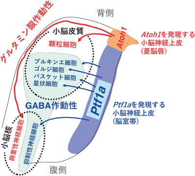 以上から,小脳全体において,「グルタミン酸作動性の興奮性神経細胞はすべて菱脳唇由来であり,GABA作動性の抑制性神経細胞はすべて脳室帯由来である」というように単純化して考えることができることになった.実際に,小脳皮質の神経細胞としては比較的マイナーであまり研究がなされてこなかったグルタミン酸作動性の単極性刷毛細胞も,菱脳唇由来であることが,その後報告された7).これまで小脳の神経細胞の個性決定機構はほとんど明らかにされていなかったが,筆者および米国の二つの研究室の論文をきっかけにして,小脳をモデル系とした各神経細胞種への運命決定の研究は大きく展開していくこととなる.