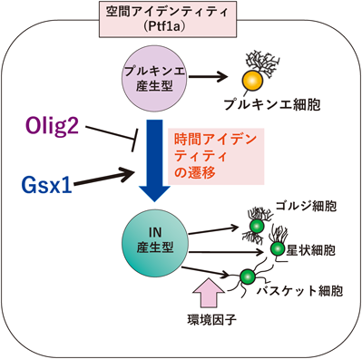 小脳抑制性神経細胞は,大きく2種類に分けられる.長い軸索で遠方へと投射するプルキンエ細胞と,それ以外の局所回路で働く介在神経細胞(インターニューロン)である.後者は,小脳核抑制性神経細胞,ゴルジ細胞,バスケット細胞,星状細胞などを含む.当時,連携大学院の早稲田大学の大学院生だった瀬戸裕介君は,小脳原基のPtf1aを発現する脳室帯の中に,さらにOlig2およびGsx1という転写因子をコードする遺伝子を発現するサブドメインがあることを見いだした10).さらに,それぞれの遺伝子座に緑色蛍光タンパク質(GFP)をノックインしたマウスを用いて,それぞれの遺伝子を発現する細胞から生み出される細胞を調べる実験(リニエージ解析)を行ったところ,Olig2を発現するものが「プルキンエ細胞」を生み出す神経上皮細胞(プルキンエ細胞産生型)であり,Gsx1を発現するものが「インターニューロン」を生み出す神経上皮細胞(インターニューロン産生型)であるとわかった(図3).さらに,小脳発生の初期段階には脳室帯の大部分の神経上皮細胞が「プルキンエ細胞産生型」であるのに,その後,細胞分裂を繰り返す時間的経過に伴って次第に「インターニューロン産生型」に遷移するということがわかった.これは言葉を変えていえば,神経上皮細胞の「時間アイデンティティ」が,「プルキンエ細胞産生型」から「インターニューロン産生型」へと遷移したということである.また,さまざまな遺伝子改変マウスの解析から,この神経上皮細胞の時間アイデンティティの遷移がOlig2によって減速され,Gsx1によって加速されるということも明らかになった.このように,神経上皮細胞の時空間アイデンティティの制御によって,興奮性・抑制性,プルキンエ細胞・インターニューロンの生み分けがなされているということが,小脳をモデル系として明らかになってきたのである.