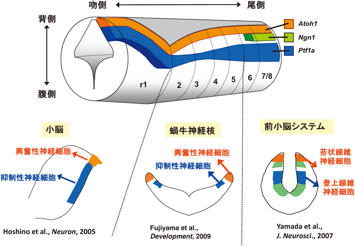 後脳は前後軸に沿って八つのロンボメア(rhombomere, r1~r8)からなる構造をなしている.筆者を含むいくつかの研究グループの研究により,Atoh1およびPtf1a遺伝子は後脳を前後に貫くように発現し,それぞれ背腹軸に沿った異なる神経上皮ドメインを形成することが明らかになっていた(図4).ちなみに,r1の背側からは小脳が生み出される.京大から一緒に東京へと異動してきた大学院生の山田さんは尾側後脳(r6~8)では,Ptf1aを発現する神経上皮ドメイン(Ptf1aドメイン)から登上線維神経細胞が生み出され,その発生にはPtf1aが必要であるということを明らかにした14).実はその少し前に,Atoh1神経上皮ドメインからは苔状線維神経細胞が生み出されることが他グループから報告されていた6).山田さんと同じく京大から異動してきた大学院生の藤山君は,中央部後脳(r2~5)では,Ptf1a神経上皮ドメインから蝸牛神経核のすべての種類の抑制性神経細胞が,Atoh1神経上皮ドメインからは蝸牛神経核のすべての種類の興奮性神経細胞が,それぞれ生み出されるということ,そしてその発生を両者の転写因子がつかさどっているということを明らかにしてくれた15).