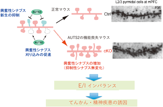 また堀室長は,AUTS2が大脳皮質や海馬において,興奮性シナプスの数を制限することを見いだした31).AUTS2は,興奮性シナプスの新規形成を抑制するとともに,刈り込みを促進することで,結果的に興奮性シナプスの数が増えすぎないように調節する.一方で,抑制性シナプスの数には影響しない.実際に,Auts2遺伝子のKOマウスでは,脳の各部位の神経細胞で興奮性シナプスが増加する(一方で抑制性シナプス数には変化がない).これにより,神経細胞における興奮性シナプス入力は増加するが,抑制性シナプス入力は変化せず,結果として脳内の神経細胞の活動性が高まることが観察された(図7).この興奮性/抑制性の不均衡(E/Iインバランス)はてんかんのみならず,さまざまな精神疾患や脳機能障害の原因・誘引となりうることが報告されてきている.なお,細胞核局在シグナルと細胞質局在シグナルを付与したAUTS2タンパク質を使った実験から,この興奮性シナプスの数を制限する機能を持つのは核内AUTS2タンパク質であることが判明した.このことから現在我々は,AUTS2が下流遺伝子の発現量を変化させることでシナプス数を制限するのではないか,と考えている.ちなみに,Auts2遺伝子を発生途上ではなく脳が完成してから時期特異的にノックアウトしても,興奮性シナプスの増加が認められるため,AUTS2はシナプスの発生だけでなく成体におけるシナプスの恒常性維持にも働いていることが示された.