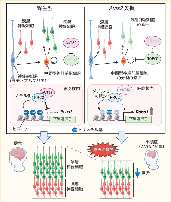 筆者の研究室の嶋岡可純研究員は,Auts2の大脳皮質特異的KO(cKO)マウスにおいて,大脳皮質の浅層神経細胞が減少し,脳が薄くなることを観察した28).一方で,深層神経細胞の数には変化がなかった.哺乳類においては,脳発生の初期ではラディアルグリアの分裂によって深層神経細胞が直接生み出されるのに対して,脳発生中期~後期では,ラディアルグリアが中間神経前駆細胞を生み出し,その後中間神経前駆細胞が1回~数回分裂することによって浅層神経細胞が生み出される場合が多い.Auts2 cKOでは,中間神経前駆細胞の分裂回数が減少することで,浅層神経細胞の数が減少する.嶋岡さんは,この中間神経前駆細胞の細胞核において,AUTS2タンパク質がPRC2と共役していろいろな遺伝子(Robo1, Slit1など)の発現を抑制することで,その細胞分裂を促進し,結果的に浅層神経細胞の数を増やす働きを持つことを明らかにしてくれた.この機能が失われると,大脳皮質浅層神経細胞が減少し,大脳皮質が薄くなってしまう.AUTS2症候群では,かなりの高確率(65%)で小頭症を併発するのだが,その背後にこうした病態メカニズムがあると考えられた(図8)28).
