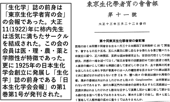 柿内先生は大正11(1922)年1月に欧文誌Journal of Biochemistryを創刊されました(創刊の経緯については別稿参照5)).同年3月に,柿内先生は活気に満ちたサークル「東京生化学者宵の会」を結成されました2, 3).この会の会員は医・理・農・薬と学際性が特徴で,柿内先生が大正8年以降御停年まで,理学部生物化学講座を兼担されていたことが幸いしました.若い学生も教授も平等に発言して,お互いを「さん」で呼び合い論じたのです.この「東京生化学者宵の会会報」が「生化学」誌の萌芽です(図1).この会は1925年の日本生化学会創立に発展しました2, 3, 6).同年10月31日の本郷佛教青年会館での第一回日本生化学会総会時の会員数は368人,演題数は37でした.生化学会発足と同時に今日の「生化学」誌の前身となる「日本生化学会会報」の第1巻第1号が発刊されてから,今年で100周年を迎えます5).初期の「日本生化学会会報」には総説欄や報告欄がありました.第二次大戦末期の被害からJournal of Biochemistryが1944年に休刊になり,それに代わる生化学の和文原著論文を掲載することとし,「日本生化学会誌」に改称されました.さらに敗戦を迎えて同誌も休刊となりました.1948年発行の第20巻から「生化学」に改称して再刊されたので,今年は100周年の年ですが「生化学」は第97巻になるのです2, 6).
