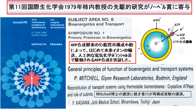 今から約1世紀も昔の柿内先生の御研究の真価は長期間を経て定着するのです5).柿内先生の行った,膜構造を持ったミトコンドリアの呼吸が含水アセトン抽出でリン脂質を除くと停止し,リン脂質を再添加すると回復するという再構成実験7)は画期的で,その後にS. Fleisherによって世界的な標準法となりました8).当時,酵素学に取りつかれていた世界中の研究者らが酸化的リン酸化の中間化合物の実証に失敗していました.そこでP. Mitchell博士はなぜミトコンドリアが膜構造なのかを考え,生体膜内外の電気化学ポテンシャル差が仮想のATP合成酵素にエネルギーを伝えてATPを合成するという化学浸透圧説を1961年に提唱したのです9).その後,筆者はATP合成酵素をリン脂質小胞に組込むコール酸透析小胞再構成法に成功し,遂に化学浸透圧説を実証しました10, 11).この成功でMitchell博士にノーベル賞が授与され,翌年の1979年のカナダでの第11回国際生化学会議のシンポジウムBioenergetics and Transportで,Mitchell博士に続き私が膜構造の再構成による膜の水素イオン輸送と中核のATP合成酵素の結晶化を報告しました(図2)10, 11).柿内先生の先駆的研究が最も輝いた瞬間でした.自宅で実験されていたMitchell博士を自治医大客員教授にお迎えして研究を続けました(図3).さらに第12回国際生化学会議では膜電位でATP合成を証明して新学説を決定的なものとしたのです11).ATP合成酵素のFoとよばれる膜内部分は水素イオンが電気化学ポテンシャル差で駆動されるエネルギーで回転するモーターであり,そのエネルギーがATP合成酵素の高次構造の変化のエネルギーとなって,ADP+PiからATPを合成するという機序が確立しました(図4)12).その功績でノーベル賞を得たJ. Walker博士と筆者の共論文も「生化学」を通して国内に広く伝えられました.